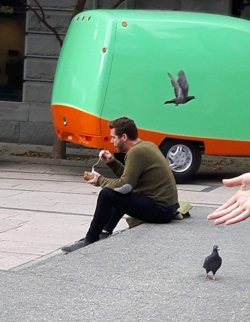 Surrealist Photograph of a Man Eating Lunch with 2 Pigeons and a Hand